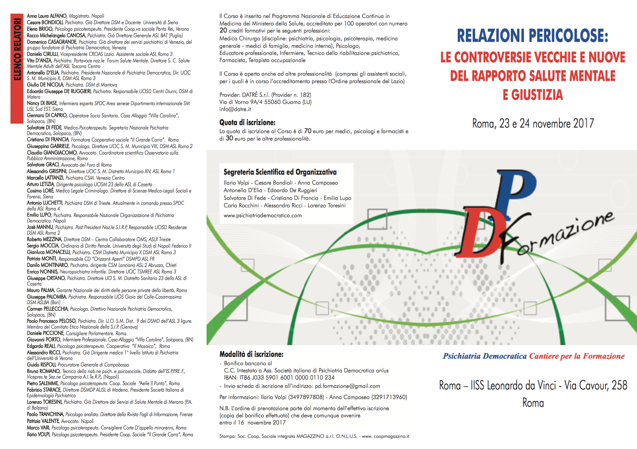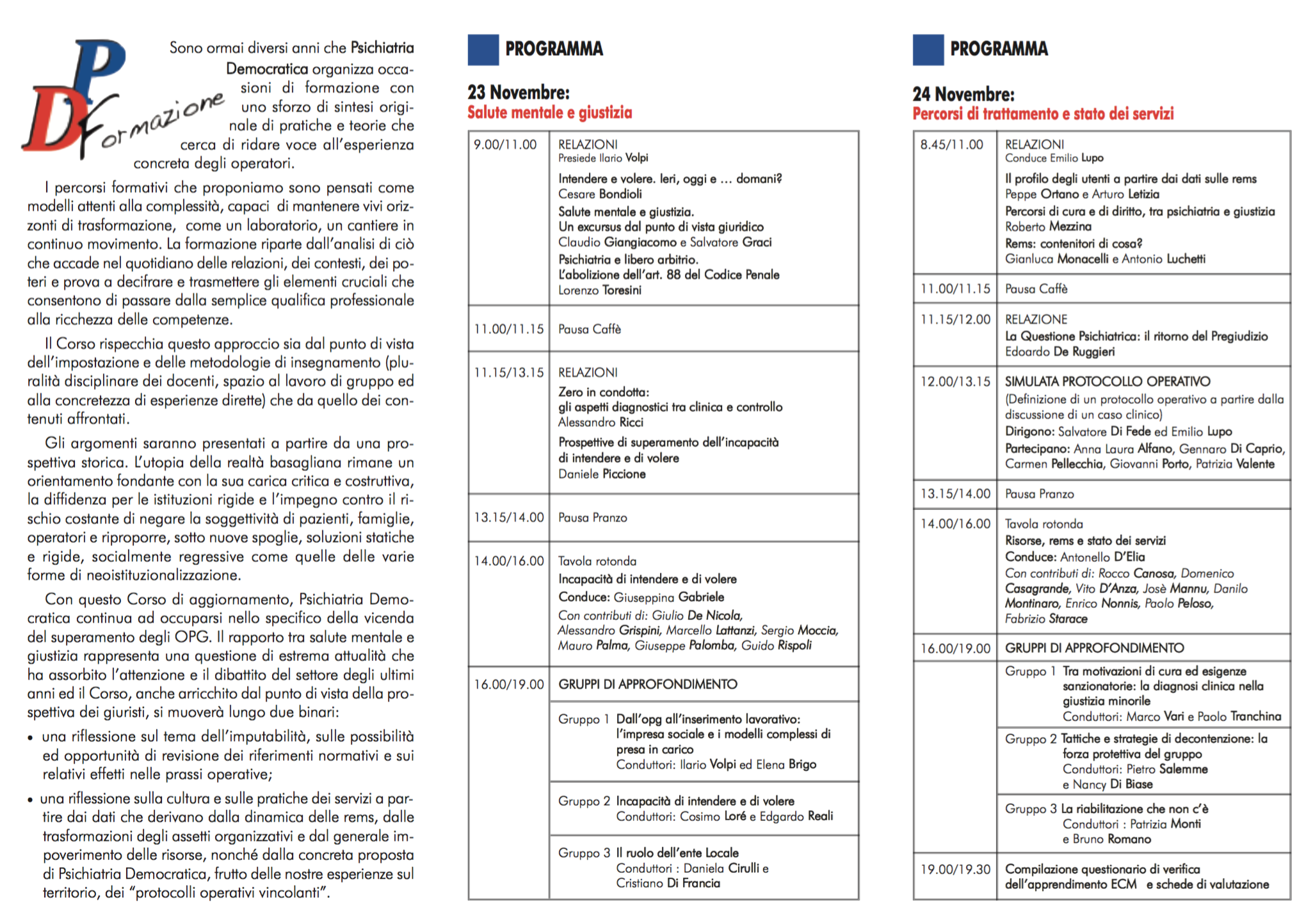 Con questo Corso di aggiornamento, Psichiatria Demo- cratica continua ad occuparsi nello specifico della vicenda del superamento degli OPG. Il rapporto tra salute mentale e giustizia rappresenta una questione di estrema attualità che ha assorbito l’attenzione e il dibattito del settore degli ultimi anni ed il Corso, anche arricchito dal punto di vista della prospettiva dei giuristi, si muoverà lungo due binari: