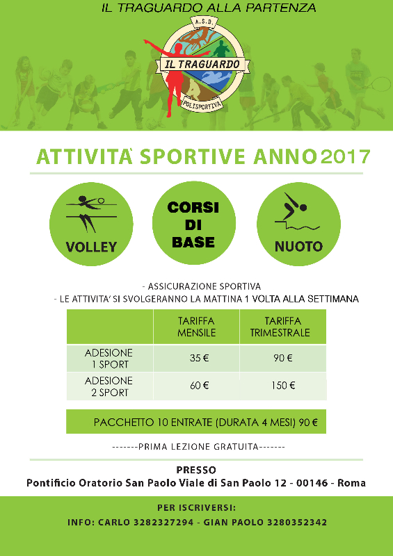 Con il motto il “Traguardo è alla partenza” la Polisportiva il Traguardo vi invita giovedì 23 febbraio per la presentazione della nuova attività di volley. L’appuntamento è alle ore 10 al Complesso sportivo del Pontificio Oratorio di San Paolo (viale San Paolo, 12).