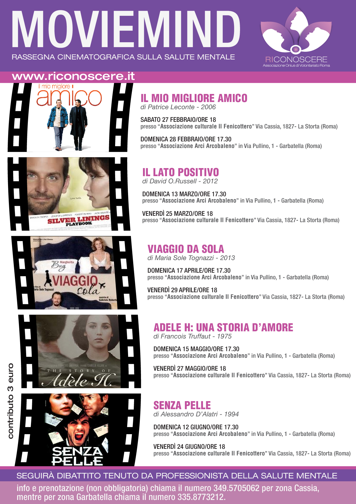 “L’Associazione RICONOSCERE ha organizzato due Cineforum a Roma sul “disagio mentale”, di cui uno presso il circolo “Arci Arcobaleno”, in zona Garbatella e uno presso l’ “Associazione Il Fenicottero” in zona Cassia – La Storta.