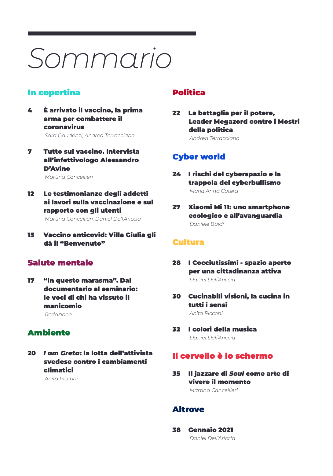 Nel numero di questo mese, parliamo di vaccino. “Mai, come da un anno a questa parte, le persone in ogni parte del mondo si trovano a condividere la sensazione di precarietà: il Covid-19 è riuscito a unire miliardi di individui, divisi da questioni di ordine politico, sociale ed economico, ma uniti nel sentirsi in balìa di qualcosa di invisibile, che può separare e portar via, e uniti dall’aiutarsi nella difficoltà comune.