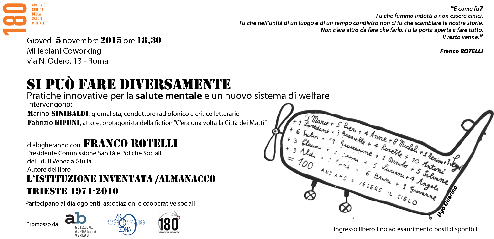 Invito Presentazione Libro L’ISTITUZIONE INVENTATA/ALMANACCO di Franco Rotelli   GIOVEDì 5 NOVEMBRE 2015 ore 18,30 Via Nicolò Odero, 13 (Garbatella) Roma SI PUO’ FARE DIVERSAMENTE Politiche innovative per la Salute Mentale e un nuovo sistema di Welfare   Partecipano   Franco Rotelli […]